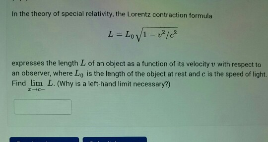 Solved Limits Of Lorentz Contraction Formula In The Theory Of Relativity The Lorentz Contraction Formula L V Lof Expresses The Measured Length By An Observer L Of An Object A8 Function Of